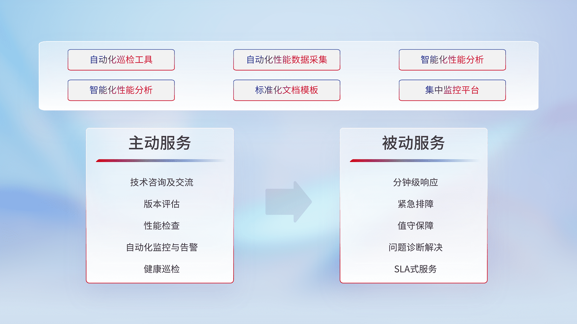 智能化工具和标准化文档,,保障服务质量,,提供主动服务(包含技术咨询、、、、版本评估、、性能检查、、自动化监控与告警、、健康巡检)和被动服务包含(分钟级响应、、紧急排障、、值守保障、、问题诊断解决、、、、SLA服务)。。。