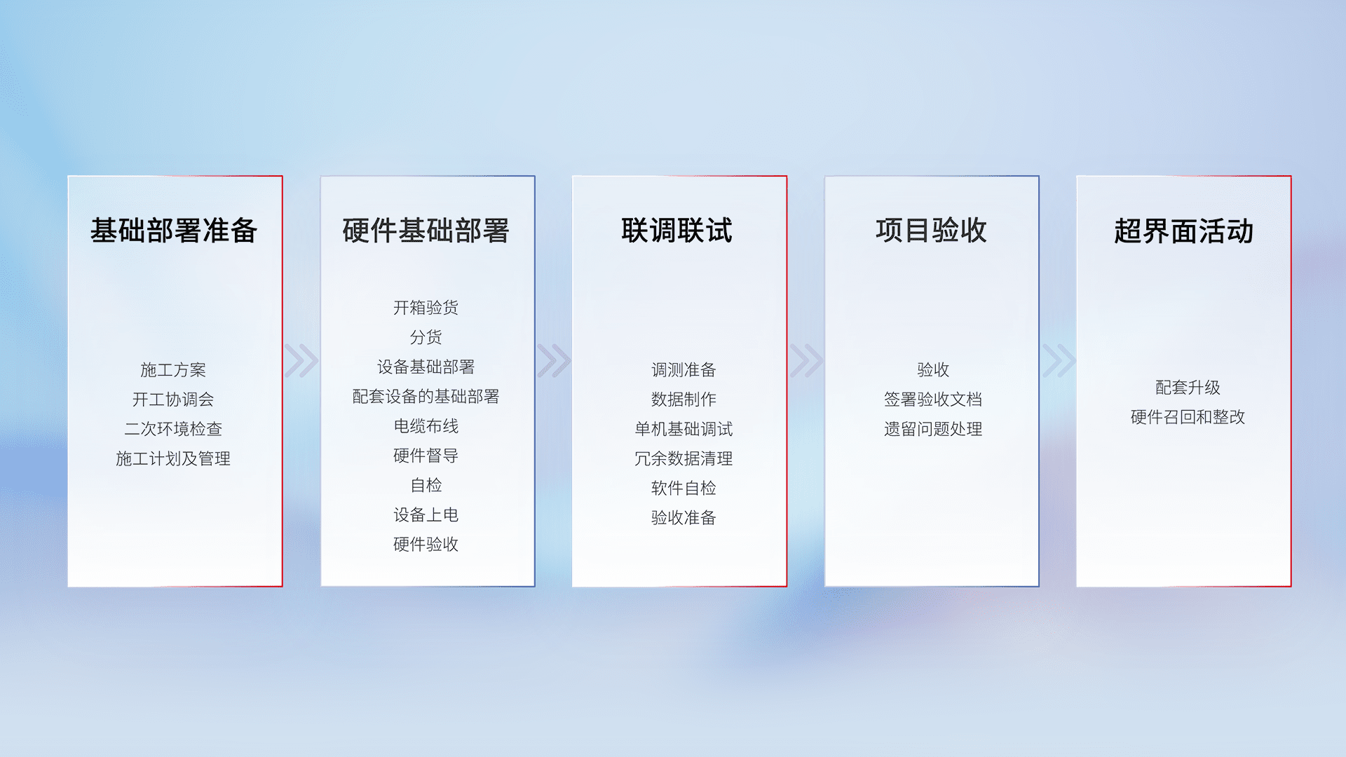 从基础部署准备、、、硬件基础部署、、联调联试、、、、项目验收、、越界面活动的全过程可追溯,,,保证施工质量和进度。。